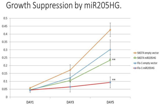 Effect of miR205HG-stable transfection on proliferation of EAC cells. miR205HG stably transfected clones were studied in water-soluble tetrazolium salt (WST-1) assays to detect the effect of exogenous miR205HG overexpression on proliferation of SKGT4 and FLO-1 EAC cell lines. Compared to vector-only transfected negative control, forced overexpression of miR205HG decreased cell proliferation on Day 5 by 45% and 69% in SKGT4 and FLO-1 cells, respectively (** p-values all < 0.001).
