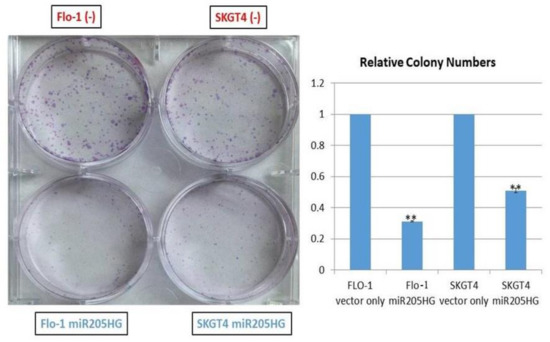 Substantial reduction in colony formation in EAC cells caused by miR205HG overexpression. Clonogenic assays revealed that miR205HG overexpression induced a substantial and significant reduction in colony formation in SKGT4 (49% reduction; ** p-value < 0.02) and FLO-1 (69% reduction; ** p-value < 0.01) EAC cell lines.