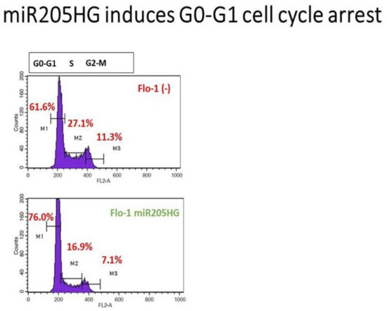 We also performed invasion/migration assays on stable FLO-1 clones and transient miR205HG-overexpressing OE33 cells using Matrigel transwell chambers (because SKGT4 cells did not attach to invasion wells). miR205HG overexpression caused substantial decreases in invasion in FLO-1 (58% reduction; p-value < 0.001) and OE33 (39% reduction; p-value < 0.03) EAC cells (Figure S1). Subsequently, to delineate potential mechanisms underlying the growth-inhibitory effects of miR205HG overexpression, we assessed cell cycle progression in miR205HG-stably transfected FLO-1 cells. Flow cytometric cell cycle assays demonstrated that vs. empty vector-transfected control cells, miR205HG overexpression caused significant accumulation of cells at G0/G1-phase and decrease at S-phase (Figure 10). Proportions of apoptotic cells in miR205HG-overexpressing vs. empty-vector negative control cell populations were similar (data not shown). Thus, miR205HG-mediated inhibition of EAC cell proliferation and colony formation are mediated by modulation of the G1-S checkpoint, rather than by apoptosis. Since miR205HG-stable clones did not manufacture any miR-205, these results establish that this host gene lncRNA per se independently exerts tumor-suppressive effects without any tumor-suppressive activity of its cognate miRNA transcript.