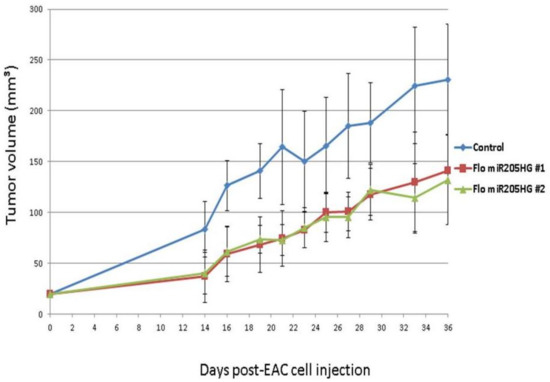 Having shown that miR205HG inhibits EAC cell growth in vitro, we next sought to demonstrate that it reduces esophageal tumor growth in vivo. We injected mice with FLO-1 cells stably transfected with vectors either lacking or containing a miR205HG insert. Fifteen athymic nude mice were evenly divided into three groups: group 1 mice were injected with cells lacking miR205HG insert (control group), while groups 2 and 3 received cells containing miR205HG insert (treatment groups 1 and 2). Treatment groups 1 and 2 were injected with two distinct clonal populations of miR205HG insert-containing cells. Interestingly, tumors in miR205HG-treated animals were already significantly smaller than in untreated controls on Day 14 (control vs. treatment group 1, p-value = 0.003; control vs. treatment group 2, p-value = 0.004); moreover, mean tumor volumes in treated groups 1 and 2 (37.1 ± 25.6 mm^3 and 40.5 ± 20.5 mm^3, respectively) were significantly smaller than in control group (83.4 ± 27.4 mm^3) (Figure 11). Significant decreases in tumor growth were observed in treated animals up to Day 36 (control vs. treatment group 1, p-value = 0.031; control vs. treatment group 2, p-value = 0.017); mean tumor volumes in treated groups 1 and 2 (140.9 ± 67.5 mm^3 and 131.9 ± 44.1 mm^3, respectively) remained significantly smaller than in the control group (231.0 ± 54.0 mm^3) (Figure 11).