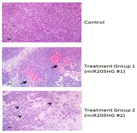 Hemorrhage, necrosis, leukocyte infiltration, and tumor cell death in miR205HG-treated murine tumors. Xenografts from vector-treated controls were composed of densely packed sheets of cells with only occasional individual cell necrosis and leukocyte infiltration. In contrast, miR205HG-treated xenografts showed extensive areas of hemorrhage and necrosis (arrows) with leukocyte infiltration (miR205HG #1) or areas of tumor cell death, accumulation of proteinaceous fluid, leukocyte infiltration, and necrotic tumor cells (arrowheads) (miR205HG #2). Scale bars = 50 um.