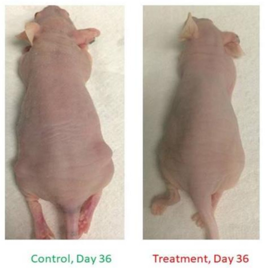 EAC cell xenograft growth inhibition by miR205HG in control and treatment mice. Notably, the mean tumor size in treatment group significantly smaller than control group.