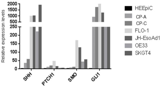 Upregulation of key Sonic Hedgehog (SHH) pathway genes SHH, PTCH1, SMO, and GLI1 in both BE and EAC cells. qRT-PCR of BE and EAC cell lines vs. primary NE (HEEpiC) cells revealed that RNA expression levels of the key SHH pathway genes SHH, PTCH1, SMO, and GLI1 were upregulated in both BE (CP-C and CP-A) cell lines and in all four EAC (FLO-1, JH-EsoAd1, OE33, and SKGT4) cell lines studied.