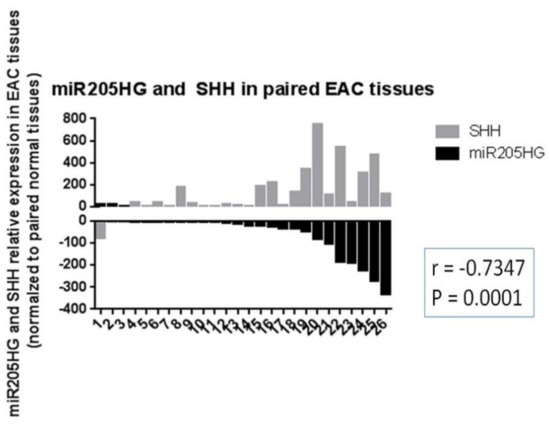 Upregulation of SHH and inverse correlation between miR205HG and SHH levels in EAC tissues. Tissues from 26 EAC patients that had already been tested for miR205HG expression were also tested for SHH expression by qRT-PCR. SHH expression was significantly upregulated relative to NE in the majority of EACs studied (23/26, average fold-change 154.7, paired t-test p-value < 0.0001). In addition, miR205HG and SHH expression levels were significantly inversely correlated (r = −0.73, p-value = 0.0001).