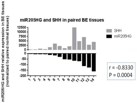 Upregulation of SHH and inverse correlation of miR205HG and SHH expression levels in BE tissues. Tissues from 14 patients with BE were tested by qRT-PCR. SHH was significantly upregulated relative to NE in all BE tissues studied (14/14, average fold-change 2913.0, paired t-test p-value < 0.0001). In addition, miR205HG and SHH expression levels were inversely correlated (r = −0.83, p-value = 0.0004).