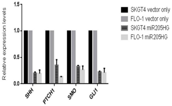Significant reductions in SHH, PTCH1, SMO, and GLI1 expression levels in miR205HG-stably transfected EAC clones. Relative to vector-only transfected negative control, miR205HG-stably transfected EAC clones exhibited significant reductions in SHH, PTCH1, SMO, and GLI1 expression levels in both SKGT4 and FLO-1 cells (p-values for all < 0.05).