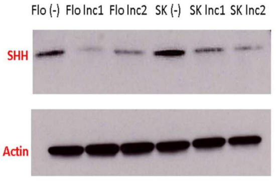 Significant reduction in SHH protein levels in SKGT4 and FLO-1 miR205HG-stably transfected clones. Western blotting demonstrated that SHH protein levels were greatly reduced in SKGT4 and FLO-1 miR205HG-stably transfected clones. Flo (−) and SK (−) denote FLO-1 and SKGT4 cells stably transfected with empty vector only. Flo lnc1 and lnc2 represent two different FLO-1 miR205HG stably transfected clones (the same labeling applies to SKGT4 cells). (full blots can be found in Supplementary Materials).