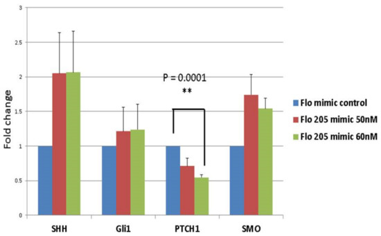Significant PTCH1 downregulation induced by miR-205 mimic transfection in EAC cells. After transfecting FLO-1 EAC cells with a negative control mimic or a miR-205 mimic, qRT-PCR was performed for four genes (SHH, PTCH1, SMO, GLI1). Only PTCH1 showed a significant (** p-value = 0.0001) reduction when transfected with 60 nM of miR-205 mimic.