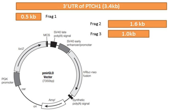 PTCH1 3′ untranslated region (3′UTR) luciferase vector design. The overall PTCH1 3′UTR luciferase vector design is shown above. One full-length PTCH1 3′UTR and three different truncated versions of PTCH1 were constructed and then cloned into vector pmirGLO.