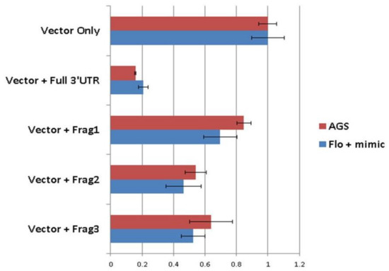 Significant reduction in luciferase activity induced by full-length 3′UTR insert in FLO-1 and AGS cells. Relative to luciferase activity after pmiRGLO vector-only transfection, the full-length 3′UTR insert caused the most significant reduction of luciferase activity in both FLO-1 and AGS cells. Vector + Frag1, 2, and 3 denote three different truncated PTCH1 3′UTR constructs.