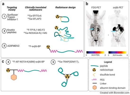 - Hackel, B.J.; Kimura, R.H.; Miao, Z.; Liu, H.G.; Sathirachinda, A.; Cheng, Z.; Chin, F.T.; Gambhir, S.S. F-18-Fluorobenzoate-Labeled Cystine Knot Peptides for PET Imaging of Integrin alpha(v)beta(6). J. Nucl. Med. 2013, 54, 1101–1105. [Google Scholar] [CrossRef][Green Version]