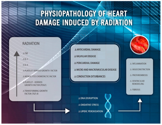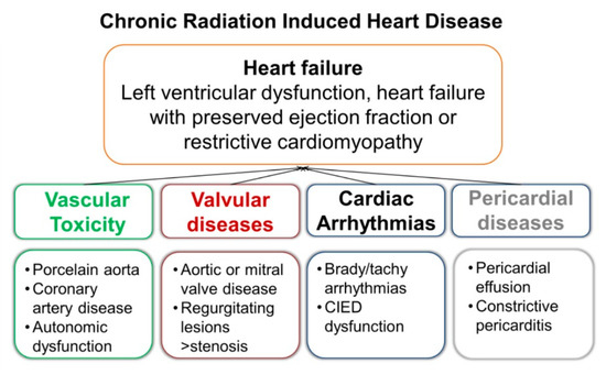 RIHD includes a wide range of cellular, metabolic, and structural complications in highly radiosensitive tissues. All cardiac structures are susceptible to radiation injury, which can be exacerbated by systemic treatments. RIHD includes valvular heart disease, premature and accelerated atherosclerosis, cardiac arrhythmias, autonomic dysfunction, pericardium diseases and heart failure. Irradiation can also damage cardiac implantable electronic devices. (Figure 2) [34,35].
