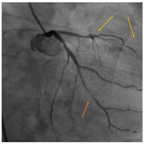 Coronary artery disease in a left breast cancer patient without cardiovascular risk factors treated with chemotherapy and radiotherapy. A long lesion with severe stenosis in the mid-distal portion of the circumflex artery (orange arrow). The left anterior descending artery (yellow arrows) also has a diffuse disease and severe stenosis (95%) in the mid-distal segment. Image courtesy of Dr. Andrés Daniele. “Ángel Roffo” Oncology Institute Buenos Aires, Argentina.