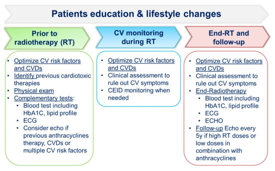 RIHD (Figure 2) usually appears several years after treatment, and the risk remains high for decades. For this reason, multidisciplinary strategies for prevention and early diagnosis are critical in BC patients (Figure 4). The baseline visit should establish an educational program, and all patients should receive structured advice on healthy lifestyle habits and treatment of cardiovascular risk factors [32]. Moreover, moderate-intense physical activity during the active treatment phase limits loss of functional capacity, improves treatment tolerance, and reduces depressive syndromes [56,103].