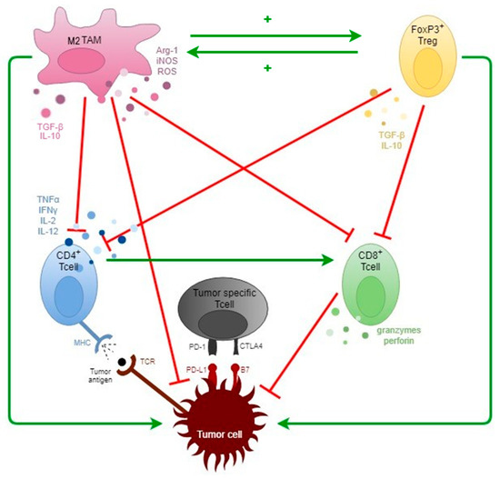 The tumor microenvironment or TME is a complex, dynamic environment that is shaped during cancer progression and may dictate tumor survival and growth by a continuous, bidirectional interaction between tumor and host cells. The eventual goal is to sustain paracrine and juxtacrine (contact-depending signaling) growth factor, nutrient- and oxygen supply, and the neutralization of an anti-neoplastic immune response, assuring tumor survival and progression. It is commonly built of neoplastic cells, supportive tissue (extracellular matrix) and cells (fibroblasts), and an immune infiltrate consisting of a grand variety of immune cells, such as neutrophils, natural killer (NK) cells, tumor associated macrophages (TAMs) myeloid derived stem cells (MDSC), dendritic cells, and several subsets of lymphocytes such as CD4+ T helper cells, CD8+ cytotoxic T cells, and regulatory CD4+Fox(forkhead box)P3+ Tcells (Treg). The immunosuppressive cell recruitment is accompanied by increased secretion of immunosuppressive cytokines (tumor necrosis factor alfa (TNFα), tumor growth factor beta (TGFβ), interleukin (IL)-10, interferon gamma (IFNγ), etc.), enzymes (arginase 1 (Arg1), inducible nitric oxide synthase (iNOS), reactive oxygen species (ROS), etc.) and upregulated expression of several surface molecules that enhance immunosuppression [26]. On this matter, expression of immune checkpoint molecules (e.g., programmed death ligand 1 and 2 (PD-L1/PD-L2), cytoxic T-lymphocyte associated protein 4 (CTLA-4), indoleamine 2,3-dioxygenase (IDO), T cell immunoglobulin and mucin domain-containing protein 3 (TIM-3), Killer-cell immunoglobulin-like receptors (KIR), T cell immunoreceptor with Ig and ITIM domains (TIGIT)) on tumor cells, antigen presenting cells (APCs), and several immune cells have led to additional proof that tumors up-regulate an immunosuppressive environment as they function as negative regulators of the T cell immune function [12]. An important finding was discovery of the positive-feedback loop between Treg cells and TAMs which is essential to maintain or promote immunosuppression within the TME (Figure 1) [27].