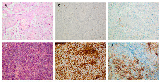 - Karpathiou, G.; Casteillo, F.; Giroult, J.-B.; Forest, F.; Fournel, P.; Monaya, A.; Froudarakis, M.; Dumollard, J.M.; Prades, J.M.; Peoc’H, M. Prognostic impact of immune microenvironment in laryngeal and pharyngeal squamous cell carcinoma: Immune cell subtypes, immuno-suppressive pathways and clinicopathologic characteristics. Oncotarget 2017, 8, 19310–19322. [Google Scholar] [CrossRef]
