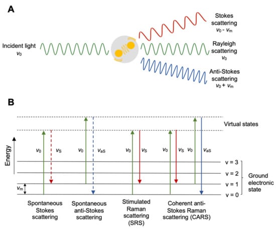 Raman spectroscopy is an essential tool for chemists, physicists, biologists, and materials scientists. It was first experimentally observed by C. V. Raman in 1928, for which he was awarded the Nobel Prize in 1930 [12]. In Raman spectroscopy, a sample is illuminated with a monochromatic laser beam (Figure 1A). The incident laser beam with a frequency of 0 interacts with a molecule in the sample that has a vibrational frequency of m. This interaction originates scattered light. The vast majority of the scattered light is elastic scattering, the so-called Rayleigh scattering. However, due to energy exchange between the incident photons and molecular vibration, there is a small fraction of inelastic scattering, which has a different frequency from that of the incident light, collectively called Raman scattering. Raman scattering consists of both Stokes scattering, which has a lower frequency at 0 − m, and anti-Stokes scattering, which has a higher frequency at 0 + m (Figure 1B) The Stokes spectrum is often presented as the Raman spectrum, due to its higher intensity, as compared to the anti-Stokes lines.