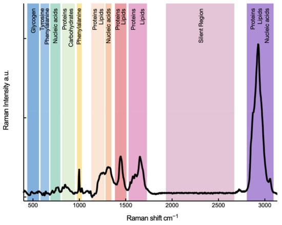 Raman spectroscopy is now increasingly popular among biologists. A Raman spectrum can be regarded as a phenotype of a biological system because it provides an overall molecular vibrational profile, containing Raman bands for major cellular building blocks, such as proteins, nucleic acids, lipids, and carbohydrates. Figure 2 illustrates a Raman spectrum of a single glioblastoma cell with Raman bands marked with assignments of major biological macromolecules. A biological Raman spectrum can be divided into three regions—the ‘fingerprint’ region that contains essential bio-information and can be seen as a fingerprint of a cell (400–1800 cm–1); the ‘silent’ region that usually does not involve vibrational modes contributed by biomolecules formed of naturally occurring isotopes and can involve bands contributed by stable isotopes or triple bonds (1800–2700 cm–1); the high-wavenumber region that is specifically contributed by the stretching vibrations of CH groups, predominantly from lipids and proteins (2700–3200 cm–1).