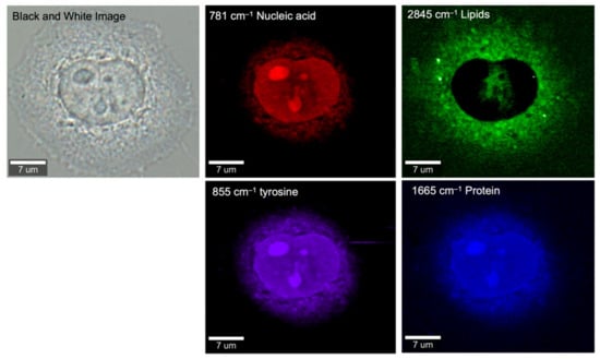 Raman images of a HeLa cell based on fingerprint Raman spectra, reconstructed from intensities at 781 (nucleic acids), 855 (tyrosine), 1665 (protein), and 2845 cm−1 (lipids). The Raman images show the distributions of these biomolecules with various intensities at the subcellular level.