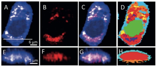 Raman imaging of SK-BR-3 cells treated with 5 µM neratinib for 8 h. Raman images reconstructed from the CH deformation (A) and CN stretching (B) intensities. (C) Overlay of Panels A and B. (E–G) Cross-section of Raman images of the same cell measured along the x–z axis. Scanning positions are indicated by the white line in Panel A. (D,H) HCA results based on the Raman data shown in Panels A and E. Reprinted with permission from reference [75].
