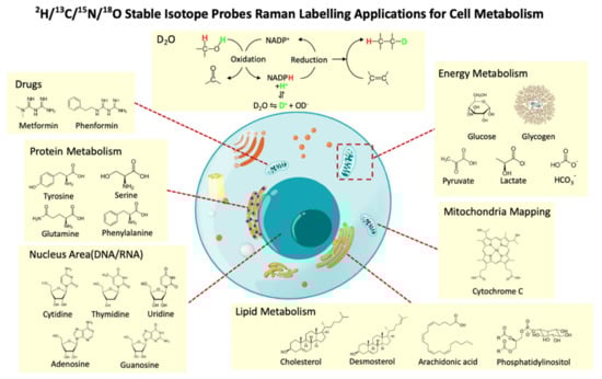 SIP to study cell metabolism, in general, shows great advantages over other specific probes that have larger molecular weights, and can disturb the intrinsic metabolic activity of cells. Using isotopes that mimic their naturally abundant counterparts does not alter the natural substrate pool. Among all SIP techniques, Raman spectroscopy has its unique strengths. While modalities like isotope ratio mass spectrometry and NMR spectroscopy require at least 300,000 cells, Raman spectroscopy or secondary ion mass spectrometry (SIMS) coupled with SIP enables an analysis of cell functions at a single-cell level [121]. However, SIMS is limited by its destructive nature and expensive equipment. Raman spectroscopy exceeds other techniques in its non-destructive, sensitive, and relatively cheap nature. While a Raman spectrum already conveys intrinsic and phenotypic information, more insight into cell functions can be obtained by combining Raman micro-spectroscopy with SIP, using D (2H), 13C, and 15N-containing substrates to replace their primordial isotopes (12C, 14N, and 1H) [116]. Among those stable isotopes, D (2H) and 13C are mostly commonly used due to the stronger C–H bond strength. Heteroatomic X–H bonds such as O–H, N–H, and S–H can be exchanged from nonenzymatic reactions, while C–H bond formation depends solely on enzyme-catalyzed chemical reactions that occurred within the metabolic pathways [122]. This provides unique advantages of D (2H) and 13C for probing the biological metabolism. Providing a wide variety of possible isotopic substrates, Raman–SIP probe the metabolism of most biomolecular constituents of a cell, including proteins, lipids, carbohydrates, and nucleic acids, revealing both molecule-specific and general metabolisms, as well as drug–cancer interactions (Figure 6).