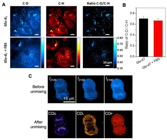 SRS imaging of cancer cells from deuterated glucose (A,B). Glucose-d7-incubated pancreatic cancer PANC1 cells were treated without or with 10% FBS for 3 days. SRS imaging at C–D and C–H vibration were taken and the ratio of C–D/C–H was used to analyze the level of de novo lipogenesis and increased lipogenesis. Reprinted and adapted with permission from reference [127]. (C) SRS images of a glucose-d7-labelled mitotic HeLa cell before and after unmixing, showing distribution of DNA, lipids, and proteins. Reprinted and adapted with permission from Reference [137].