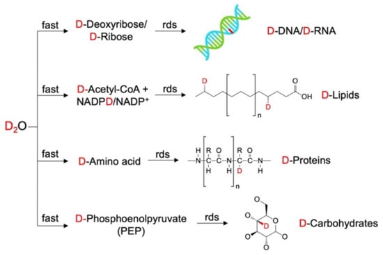 D2O as a unique and universal tracer for different biomolecules. ‘rds’ stands for rate-determining step.