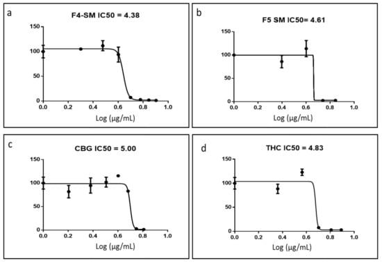 In order to confirm the active compositions of F4 and F5, IC50 values of the phytocannabinoid standard mix (SM) of each fraction were examined and calculated. SM is the mix of phytocannabinoid standards equivalent of the primary phytocannabinoids in Table 1, at the appropriate percentages to be as close to F4 and F5 as possible. F4-SM had an IC50 of 4.38 µg/mL (Figure 2a), which was lower than that of F4 (9.81 µg/mL). F5-SM showed an IC50 value of 4.61 µg/mL (Figure 2b), again lower than F5 (7.01 µg/mL). F4-SM showed a significant reduction of cell proliferation at sub-lethal concentrations (~110% of cell proliferation in comparison to ~200% in F4 treatments; Figure 2a). However, F5-SM led to similar levels of cell proliferation at sub-lethal concentrations in comparison to F5 (~115% and ~110%, respectively; Figure 2b). Interestingly, CBG, the primary molecule of F4, was less active than F4-SM (IC50 of 4.38 and 5.00 µg/mL for F4-SM and CBG, respectively; Figure 2c). Similarly, THC, the primary molecule of F5, was less active than F5-SM (IC50 of 4.61 and 4.83 µg/mL for F5-SM and THC, respectively; Figure 2d).
