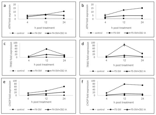 To explore the possible induction of ER-stress by F4-SM and F5-SM treatments, we determined the expression of ATF4, TRIB3, and CHOP (DDIT3-3) genes. F4-SM and F5-SM treatments substantially induced these gene expressions (Figure 5; Supplementary Table S2), with the highest ATF4 expression at 24 h (Figure 5a,b; Supplementary Table S2). TRIB3 expression was the highest at 12 h in both treatments (Figure 5c,d; Supplementary Table S2). CHOP expression was the highest at 24 h with F4-SM or 12 and 24 h with F5-SM treatments (Figure 5e,f; Supplementary Table S2). Co-treatment with CB2 IA considerably reduced induction by F4-SM or F5-SM of all gene expression (Figure 5; Supplementary Table S2).