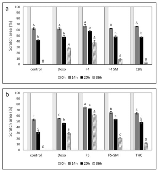 Effect of F4, F5, F4-SM, or F5-SM on A172 cell migration. Cells were treated with (a) F4 (20 µg/mL); F4-SM (11.5 µg/mL) or CBG (9.2 µg/mL) (b) F5 (20 µg/mL); F5-SM (11.5 µg/mL) or THC (10.5 µg/mL). Control is vehicle control (1.15% v/v methanol). Doxorubicin (Doxo, 0.5 µg/mL) served as a positive control. Percent scratch area is presented as mean; error bars indicate ± SE (n = 3). Levels with different letters are significantly different from all combinations of pairs according to the Tukey–Kramer honest significant difference (HSD; p ≤ 0.05).