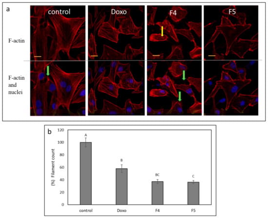 (a) Representative examples of confocal images of A172 cells following treatment with F4 (12 µg/mL) and F5 (10 µg/mL) for 24 h. F-actin (EasyProbes™ ActinRed 555 Stain, red stain) and nuclei (Hoechst, blue stain) were stained. Control is vehicle control (1.15% v/v methanol). Doxorubicin (Doxo, 0.5 µg/mL) served as a positive control. Scale bars = 20 µm; n = 3. Yellow arrows point to the disintegration of F-actin filaments visualized as characteristic spots; green arrows show F-actin filopodia protruding from cells. (b) The number of F-actin filaments that crossed a line drawn across the soma in each of the treatments. The percent number of filaments is presented as mean; error bars indicate ± SE (n = 5). Levels with different letters are significantly different from all combinations of pairs according to the Tukey–Kramer honest significant difference (HSD; p ≤ 0.05).