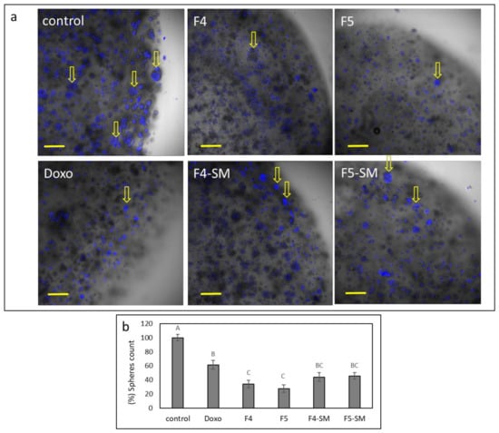 (a) Examples for representative confocal images of U87 cells following treatment with F4 (20 µg/mL), F5 (16.5 µg/mL), F4-SM (12.5 µg/mL), and F5-SM (10 µg/mL), for 8 d. Doxorubicin (Doxo, 2.0 µg/mL) served as a positive control. Control is vehicle control (2.0% v/v methanol). Overlay of brightfield and Hoechst staining for nuclei (blue color) is shown in five concurrent optical sections; scale bars = 200 µm; n = 3. Arrows point to some of the colonies that formed. (b) Percentage of the number of colonies in each of the treatments (out of the average number of colonies in the control), presented as mean; error bars indicate ± SE (n = 3). Levels with different letters are significantly different from all combinations of pairs according to the Tukey–Kramer honest significant difference (HSD; p ≤ 0.05).