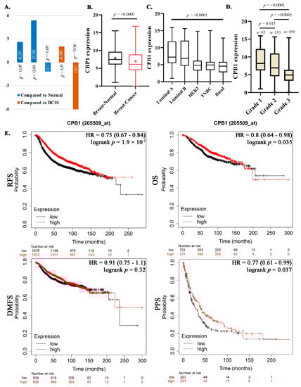 Expression of carboxypeptidase B1 (CPB1) in human transcriptome array (HTA) data and breast cancer (BC) datasets. Fold change in the expression level of CPB1 gene according to HTA analysis. Five samples for each step of BC progression were used for HTA analysis. p-value was determined by one-way between-subject ANOVA (A). The expression level of CPB1 in breast cancer tissue samples (N = 5574) than normal breast tissue samples (N = 474). p-value was calculated by unpaired Student’s t-test (B). The expression level of CPB1 across different BC molecular subtypes of BC patients: luminal A (N = 379), luminal B (N = 244), HER2 (N = 230), TNBC (N = 251) and basal (N = 363) in a gene expression database (GENT2) dataset. The p-value was calculated using Kruskal–Wallis one-way analysis of variance (C). The difference in CPB1 expression pattern according to the tumor’s grade in the GENT2 dataset (D). Effect of CPB1 on survival outcome of BC patients: RFS = reversal free survival; OS = overall survival; DMFS = distance metastasis-free survival; PPS = post-progression survival (E).