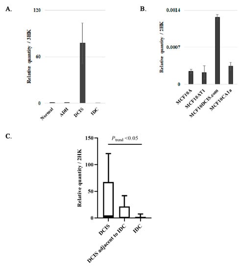Breast cancer (BC) progression is thought to progress in three different steps from normal breast cells to atypical ductal hyperplasia (ADH), ductal carcinoma in situ (DCIS), and invasive ductal carcinoma (IDC). However, the route of progression up to an IDC is controversial. There are several theories regarding BC progression: (i) ADH does not need to go through the DCIS step to progress to IDC; (ii) DCIS is not the precursor of IDC; the two diseases have different origins, and (iii) each DCIS has a genetic makeup/alteration required to become IDC and hence is considered a precursor for IDC [1]. Studies analyzing gene and protein expression patterns in all these different BC progression lesions have identified that the expression pattern of DCIS is very different from that of normal breast cells or ADH and the gene expression pattern of DCIS is altogether more similar to IDC [2,3,4]. Apart from the overlapping expression pattern from these studies, a previous study from our group also has identified a unique set of genes only expressed in DCIS or IDC, highlighting their difference from each other as well as from normal cells and ADH lesions [5].