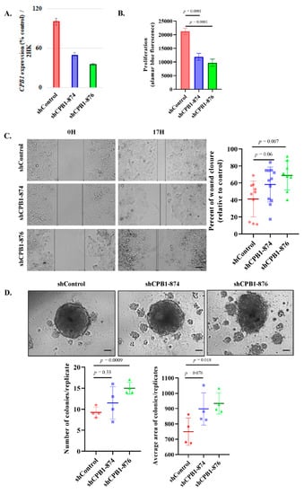 To understand the role of CPB1, we knocked down CPB1 expression using two different shRNAs, achieving around 51% and 65% reduction in CPB1 expression (shCPB1-874 and shCPB1-876, respectively; Figure 3A) in the MCF10ADCIS.com cell line. We further analyzed the effect of CPB1 knockdown on proliferation, migration, and 3D colony formation (spheroid assay) in MCF10ADCIS.com cell line. Results show 43.8% (p-value = 0.0001) and 54.1% (p-value = 0.0001) decrease in proliferation (Figure 3B), and 16.3% (p-value = 0.06) and 27.08% (p-value = 0.007) increase in migration with shCPB1-874 and shCPB1-876, respectively than control (Figure 3C). Furthermore, we found an increase in both the number and average area of colonies formed in 3D colony formation. KD with shCPB1-874 increased the number of colonies by 24.3% (p-value = 0.33) and the average area of colonies by 19.8% (p-value = 0.076). As for shCPB1-876, an increase of 62.16% (p-value = 0.0009) in the number of colonies and 24.5% (p-value = 0.018) in average size of colonies was observed (Figure 3D).