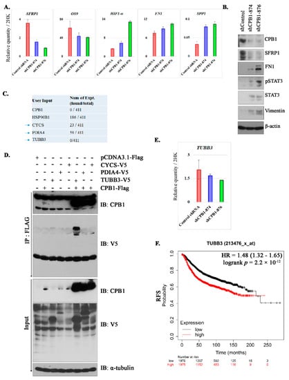 We further investigated the interactors of CPB1 by affinity-purified mass spectrometry. Due to the low copy of CPB1 in the mass-spectrometric analysis, only 4 interactors were identified. We analyzed these interactors in the Contaminant repository for affinity purification (CRAPome) database to identify the interactors normally pulled down with flag-tag (Figure 4C). Based on the results from CRAPome analysis, we selected 3 proteins for validation: CYCS, PDIA4, and TUBB3. IP analysis identified TUBB3 as a true interactor of CPB1 (Figure 4D). We then pursued to understand what happens to TUBB3 expression when we knockdown CPB1. The qPCR data show a decrease in the mRNA level of TUBB3 upon CPB1 KD (Figure 4E). Furthermore, we analyzed the effect of TUBB3 expression in BC patients from an online dataset (https://kmplot.com/, accessed on 6 December 2020) and found that TUBB3 expression is associated with poor RFS in BC patients (Figure 4F).