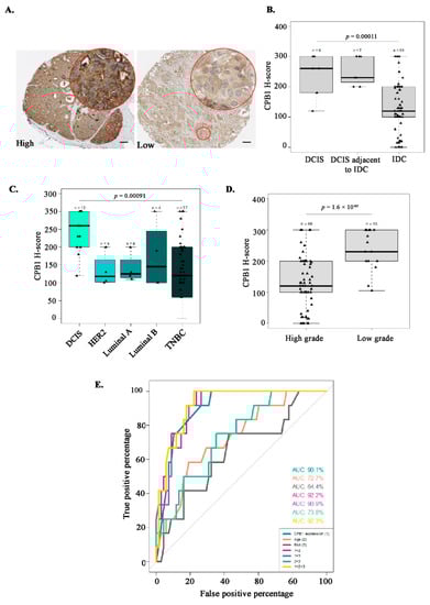 In addition, our data also underline the fact that high CPB1 expression is associated with low-grade BC. Out of the 39 patients with high CPB1 expression, we observed that 2.6% (1/39) were of grade 1, 30.8% (12/39) were of grade 2, and 66.7% (26/39) were of grade 3 tumors. On the other hand, out of 42 low CPB1 expressing patients, 0% (0/42) were of grade 1, 4.8% (2/42) were of grade 2, and 95.2% (40/42) were of grade 3 tumors. This difference was statistically significant (p-value = 0.003; Table 1). This is also represented in Figure 5D, where low-grade BC represents grades 1 and 2, and high-grade BC represents grades 3 (p-value = 1.6 × 10−5). As grading for DCIS and IDC is different, we examined CPB1 expression in low vs. high-grade DCIS and IDC separately and found a similar pattern for DCIS only (p-value = 0.33) and IDC only (p-value = 0.06), although these associations were not significant (Figure S2A,B). A higher proportion of patients with microcalcifications was found in the high CPB1 expression group (33.3%) compared with the low CPB1 expression group (20.9%) but without a significant difference between both groups (p-value = 0.33). The CPB1 score of expression was higher in the presence of microcalcifications (N = 22) compared with in absence of microcalcification (N = 60; p-value = 0.051; Figure S3A).