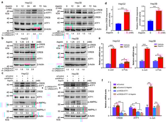 Aspirin induces (PKA)-cAMP response element-binding protein (CREB /ATF1) activation through AMP-activated protein kinase (AMPK). (a) HepG2 and Hep3B cells were treated with aspirin for indicated periods, followed by western blot analysis with indicated antibodies. The relative levels of p-CREB/ATF1 normalized to total CREB/ATF1 were shown. (b) HepG2 and Hep3B cells were treated with indicated doses of aspirin for 32 h, followed by western blot analysis with indicated antibodies. The relative levels of p-CREB/ATF1 normalized to total CREB/ATF1 were shown. (c) HepG2 and Hep3B cells were transfected with siControl or siAMPKα1 and treated with or without aspirin for 32 h, followed by western blot analysis with indicated antibodies. The relative levels of p-CREB/ATF1 normalized to total CREB/ATF1, and the relative levels of p-AMPK and AMPKα1 normalized to β-actin were shown. (d) HepG2 and Hep3B cells were transfected with the CREB luciferase reporter plasmid and the renilla luciferase plasmid, followed by treatment with or without aspirin for 24 h. The luciferase activities were measured using a dual-luciferase reporter assay kit. The CREB-responsive promoter activity was normalized by the renilla luciferase values. The relative CREB-responsive promoter activity was plotted. Values represent means ± SD (n = 4). ***, p < 0.001. (e) HepG2 and Hep3B cells were treated with or without 5 mM aspirin for 48 h, followed by real-time RT–PCR analysis of c-Jun and c-Fos transcription. The relative mRNA levels were plotted. Values represent means ± SD (n = 3). *, p < 0.05, ***, p < 0.001. (f) HepG2 cells were transfected with siControl or siCREB/ATF1 and treated with or without 5 mM aspirin, followed by real-time RT–PCR analysis of indicated genes. The relative mRNA levels were plotted. Values represent means ± SD (n = 3). **, p < 0.01. ***, p < 0.001. n.s., not significant.