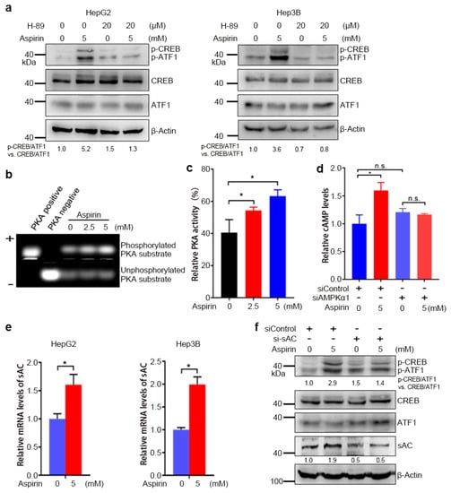 Soluble adenylyl cyclase (sAC) is one of the enzymes that catalyze cAMP synthesis [34]. We then detected whether the induction of CREB/ATF1 phosphorylation by aspirin is dependent on sAC. Treatment of HepG2 cells with aspirin led to increased sAC expression in both HepG2 and Hep3B cells (Figure 2e). Furthermore, sAC knockdown compromised the induction of CREB/ATF1 phosphorylation by aspirin (Figure 2f). Together, these data indicate that the induction of CREB/ATF1 phosphorylation by aspirin is dependent on sAC.