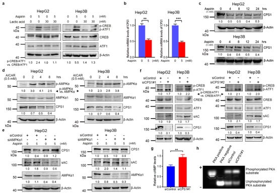 The expression and activation of sAC are regulated by intracellular bicarbonate levels (HCO3−) [38]. We found that treatment with lactic acid, the HCO3− neutralizer, abrogated the induction of CREB/ATF1 phosphorylation by aspirin in both HepG2 and Hep3B cells (Figure 3a), suggesting that bicarbonate may mediate the induction of the sAC–cAMP–CREB axis by aspirin. It is known that carbonic anhydrase (CA) is responsible for the production of bicarbonate. However, aspirin did not affect the expression of the tumor-associated CA2, CA9 and CA12 (Figure S5). Of note, the urea cycle enzyme CPS1 catalyzes the condensation of ammonia with bicarbonate into carbamoyl phosphate. Hence, CPS1 may deplete both ammonia and bicarbonate. We then detected the effect of aspirin on CPS1. Treatment of HepG2 and Hep3B cells with aspirin led to decreased CPS1 expression at both mRNA and protein levels (Figure 3b,c). A previous study demonstrated that AMPK inactivation might lead to an increase in FOXA1-dependent CPS1 transcription in KRAS/LKB1-mutant NSCLC cells [27]. We then detected the effect of AMPK on CPS1 expression in HCC cells. The AMPK agonist AICAR inhibited CPS1 expression in both HepG2 and Hep3B cells (Figure 3d). AMPK knockdown abrogated the downregulation of CPS1 and upregulation of sAC by aspirin (Figure 3e), suggesting that aspirin inhibited CPS1 expression and promoted sAC expression through AMPK. Except for bicarbonate accumulation, a rise in intracellular ammonia levels may result from decreased CPS1 expression. Treatment of HepG2 cells with the ammonia donor NH4Cl did not induce CREB/ATF1 phosphorylation, suggesting that ammonia is not attributable to CREB/ATF1 phosphorylation (Figure S6).