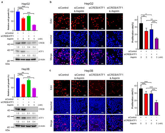 To determine the effect of CREB/ATF1 on the sensitivity of HCC cells to aspirin, HepG2 and Hep3B cells were transfected with siControl or siCREB/ATF1, followed by treatment with or without aspirin. Forty-eight hours later, cell growth was detected by CCK-8 assays. CREB/ATF1 knockdown sensitized HepG2 and Hep3B cells to aspirin (Figure 4a). In addition, EdU assays demonstrated that aspirin in combination with CREB/ATF1 knockdown significantly inhibited both HepG2 and Hep3B cell proliferation (Figure 4b,c). These data suggest that CREB/ATF1 activation may antagonize the anti-cancer effect of aspirin, and targeting CREB/ATF1 may be a strategy to sensitize HCC cells to aspirin.