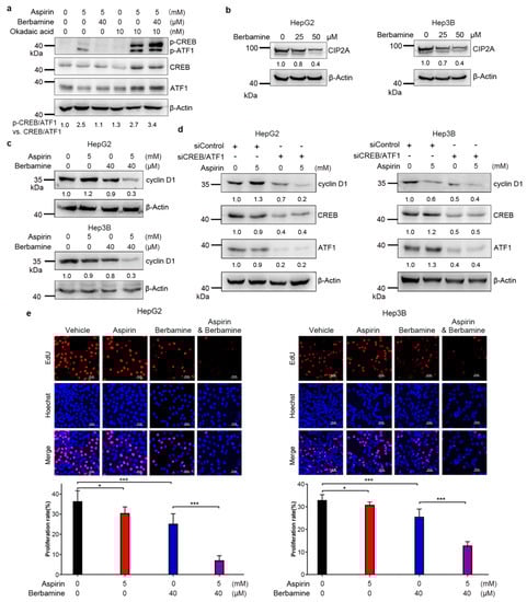 Berbamine inhibits protein phosphatase 2A (CIP2A) expression, promotes PP2A-mediated CREB/ATF1 dephosphorylation, and potentiates the inhibition of cyclin D1 expression in HCC cells. (a) HepG2 cells were treated with or without aspirin, berbamine and okadaic acid, followed by western blot analysis of CREB/ATF1 phosphorylation. The relative levels of p-CREB/ATF1 normalized to total CREB/ATF1 were shown. (b) HepG2 and Hep3B cells were treated with indicated doses of berbamine, followed by western blot analysis of CIP2A. The relative levels of CIP2A were shown. (c) HepG2 and Hep3B cells were treated with aspirin and/or berbamine for 48 h, followed by western blot analysis of cyclin D1 expression. The relative levels of cyclin D1 were shown. (d) HepG2 and Hep3B cells were transfected with siControl or siCREB/ATF1 and treated with or without aspirin for 48 h, followed by western blot analysis of indicated proteins. The relative levels of cyclin D1, CREB and ATF1 were shown. (e) HepG2 and Hep3B cells were treated with aspirin individually or in combination with berbamine for 48 h, followed by detecting proliferative cells with EdU assays. Scale bar, 50 μm. The proliferation rate was plotted. Values represent means ± SD (n = 3). ***, p < 0.001.