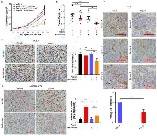 The tumor-suppressive effect of aspirin in combination with berbamine was detected in the HepG2 xenografts model. While aspirin- or berbamine-treated tumors tended to be smaller than vehicle (control)-treated tumors, this difference was not statistically significant. The combination of aspirin and berbamine more significantly inhibited tumor growth compared to the single-agent (Figure 7a,b). Immunohistochemical analysis of PCNA in tumor samples demonstrated that the combination of aspirin and berbamine more significantly inhibited cancer cell proliferation than single-agent (Figure 7c). Consistent with the in vitro data, treatment with aspirin led to increased CREB/ATF1 phosphorylation in tumors, which was abrogated by berbamine (Figure 7d). Whereas aspirin downregulates CPS1 via inducing AMPK activation in HCC cells, a previous study demonstrates that aspirin does not induce AMPK phosphorylation in the normal liver [15]. We then detected the effects of aspirin on CPS1 expression in liver tissues and xenograft tumors. Whereas aspirin inhibited CPS1 expression in HCC xenografts (Figure 7e), it did not affect CPS1 expression in liver tissues (Figure S10). Meanwhile, aspirin did not induce CREB/ATF1 phosphorylation in the normal liver tissues (Figure S10).