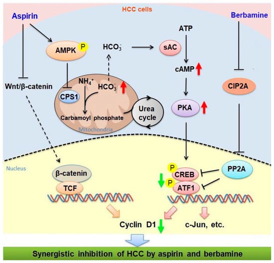 Schematic illustration of the signaling pathways that are involved in the synergistic inhibition of HCC by aspirin and berbamine. While aspirin may inhibit Wnt/β-catenin signaling, it can activate AMPK, leading to downregulation of CPS1 in HCC cells. Downregulation of CPS1 diverts bicarbonate to stimulate sAC, thereby increasing cAMP synthesis, which may contribute, at least in part, to the stimulation of PKA activation and CREB/ATF1 phosphorylation in HCC cells by aspirin. Berbamine can inhibit CIP2A expression in HCC cells, leading to PP2A-dependent abrogation of aspirin-induced CREB/ATF1 phosphorylation and target gene expression. Thus, the combination of aspirin and berbamine can synergistically inhibit HCC. Red arrows represent the upregulation of indicated molecules by aspirin. Green arrows represent the net effects of combined treatment with aspirin and berbamine on indicated proteins.