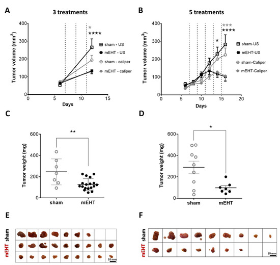 Follow-up measurements of the tumors by ultrasound (US) and a digital caliper demonstrated a decline in the tumor growth rate in the mEHT-treated group (Figure 1) Tumor volume significantly decreased after three treatments in the mEHT-treated group as measured both by caliper (p = 0.0363) and US (p < 0.0001) (Figure 1A). Further (4–5) treatments were able to reduce tumor size. The difference in volume became even larger after five treatments (US: p < 0.0001, caliper: p = 0.0003) (Figure 1B). Comparison of the final and initial tumor volumes demonstrated a higher growth ratio in sham-treated (three treatments: US: 5.0, caliper: 2.7; 5 treatments: US: 4.7, caliper: 6.0), than in mEHT-treated (three treatments: US: 2.1, caliper: 1.8; 5 treatments: US: 2.0, caliper: 3.0) tumors. The weights of the excised tumors were also significantly smaller in the mEHT-treated than in the sham group after three (p = 0.0091) and five treatments (p = 0.0206) (Figure 1C,D). The excised tumors were significantly smaller in the mEHT-treated versus sham-treated mice (Figure 1E,F). After five treatments in one mEHT-treated mouse, ultrasound demonstrated a small tissue at the site of the tumor. However, by dissection and histological analysis, this tissue was shown to contain no tumor cells, only fat and connective tissue. Therefore, this tumor was regarded as treated (Figure 1F) and its data were included in the tumor growth (Figure 1B) but not in the tumor weight (Figure 1D) data.