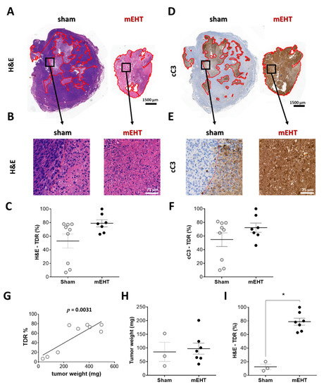 The tumor destruction ratio (TDR), evaluated in hematoxylin and eosin (H&E) sections, demonstrated remarkable tumor tissue destruction in the mEHT-treated tumors (TDR: mEHT: 78.9 ± 5.1% vs. sham: 52.8 ± 10.3%) (Figure 2A,B). Besides the three small tumors in the sham group, TDR was not significantly smaller in the sham-treated animals than in the mEHT group (Figure 2C). The destroyed area identified on the H&E sections stained cleaved caspase-3 (cC3) positive on consecutive cC3-stained sections, confirming a caspase-dependent manner of tumor destruction (Figure 2D–F). The complete set of all tumors (H&E and cC3 staining) is presented in the Supplementary Material (Figure S1). 410.4-derived tumors developed a necrotic core after reaching a certain size [29]. In the present study TDR strongly correlated with tumor size (Figure 2G). Comparison of TDR in tumors of similar size (sham vs. mEHT, Figure 2H) demonstrated a significant increase (p = 0.0167) in TDR by mEHT treatments, corroborating that in the sham group TDR elevation was size-dependent, whereas in the mEHT group it was size-independent but treatment-related (Figure 2I).