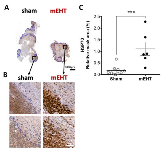 Effect of mEHT treatment on Hsp70 expression 24h after the 5th mEHT treatment. Representative tumors from sham and mEHT-treated mice with Hsp70 staining (0.9× magnification), black rectangles magnified at ‘B’ (A). Representative sections of Hsp70 expression near the damaged tumor area (blue annotation), 40× magnification (B). Expression of Hsp70 evaluated in the intact tumor tissue (blue annotations) significantly increased in mEHT-treated tumors (C). In one case, TDR appeared to be 100% and no living area remained to be evaluated for Hsp70 expression. Mean ± SEM, Mann-Whitney test, n = 6–9/group, ***: p < 0.001. Cell line: 4T07, 5× treated.