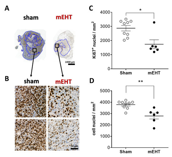 Most cell nuclei in sham tumors were intensely positive for the Ki67 proliferation marker in the living tumor area (Figure 4A,B). mEHT treatment significantly decreased Ki67 positivity (p = 0.0120) (Figure 4C). The number of total cell nuclei counted in the living tumor area was also significantly lower in the mEHT-treated compared to the sham-treated group, with a significantly less dense tissue structure due to mEHT treatments (p = 0.0048) (Figure 4D).