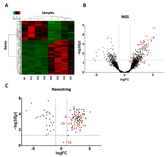 Heat map and volcano plot visualization of DE genes after three mEHT treatments. Heat map clusterization with dendograms (Kendall tau’s method, dendogram details: Figure S2) of differentially expressed (DE) genes according to the next generation sequencing (NGS) RNA seq data. Columns represent samples, rows represent genes. Red = upregulation, green = downregulation (A). Volcano plot of all genes according to the NGS RNA seq data (B). Volcano plot of DE genes from the Nanostring data (C). (B,C) −log10(p) values plotted against fold changes (logFC). Vertical dotted line: logFC = 1, horizontal dotted line: −log10(p) = 1.30103. n = 4–6/group. Red dots with numbers mark genes identified in Table 1. Cell line: 4T1, 3× treated.