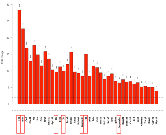 The protease inhibitors (serpins and ITIHs) have been described as ancient markers of cell stress [55]. Serine protease inhibitor family A member 3 (Serpina3) was reported as an antiapoptotic factor in trophoblast cells [56]. Furthermore, high expression of Serpina3 was reported in colon [57] and endometrial [58] cancers, and in melanoma [59]. Serpina3n was described as a cellular stress response gene in different types of stress and has been associated with a wide range of diseases such as photoreceptor cell loss in a retinal degeneration mouse model [60], and muscle atrophy in mice and humans [61]. The other members of these protease inhibitors detected, namely Itih2,4 and SerpinA3c,m, had very low absolute mRNA copy numbers, especially in the sham animals, hardly exceeding background values. Even in the mEHT-treated animals, copy numbers were low. Thus, we did not investigate these factors further.